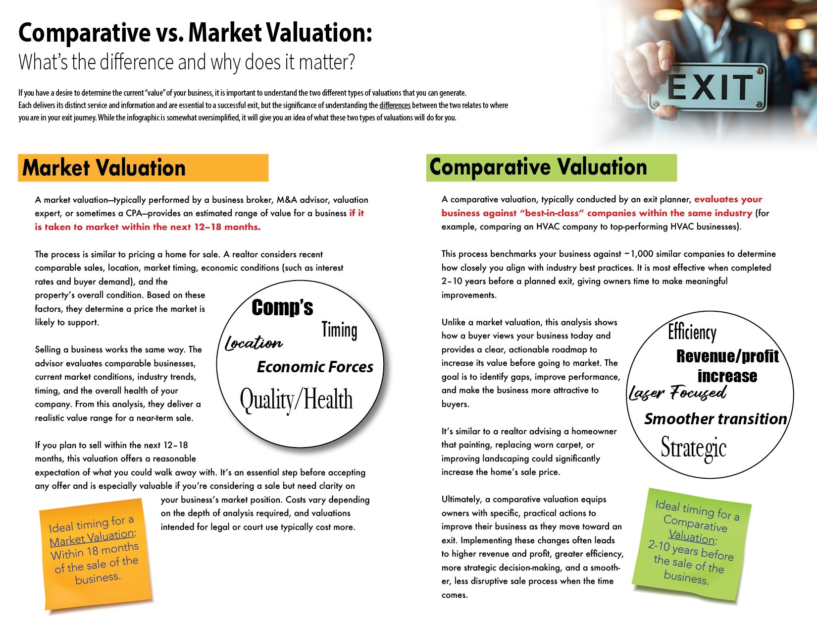 The key to significantly accelerating the value of your business as you approach your exit is by implementing a comprehensive system upon which your business can effectively operate. By adopting the Entrepreneurial Operating System (EOS), you will successfully accomplish two crucial objectives - first, you will demonstrate to potential buyers that the business is not dependent on the owner, which in turn will substantially increase your profit at the point of sale. Secondly, it will empower you, the owner, to begin living the life you always dreamed of, a life that this business was meant to provide one day. By effectively implementing EOS into the business framework, the owner gains a clearer vision of what life can truly look like beyond the demands of running the business day-to-day. CLICK HERE to learn more about EOS.