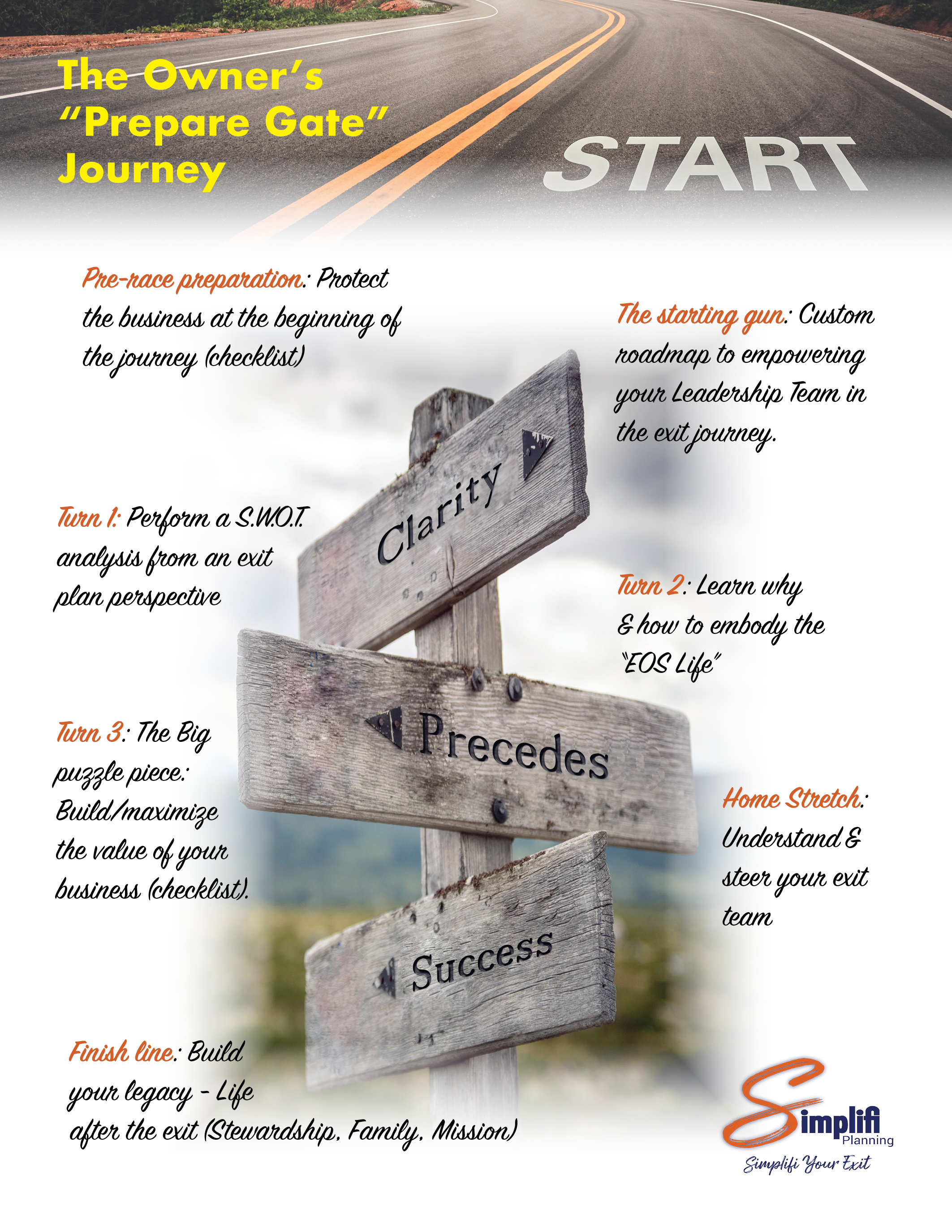 The exit planning journey is composed of three distinct phases (Discover, Prepare, Decide), all meticulously designed to guide you, the business owner, through the SIMPLIFI process of objectively identifying what your business is worth today, determining what it could potentially be worth in the future, and discovering effective ways to enhance that value throughout this exit process. By carefully implementing the key strategies that are identified along the way, your business will not only become more profitable, but also thrive as you navigate toward the finish line. Todd (Certified Exit Planning Advisor, CEPA®️) will be your committed partner, providing invaluable support, accountability, and expertise as you work toward your ultimate destination. He will show you how to execute on your exit journey in order to effectively achieve all of your goals.
